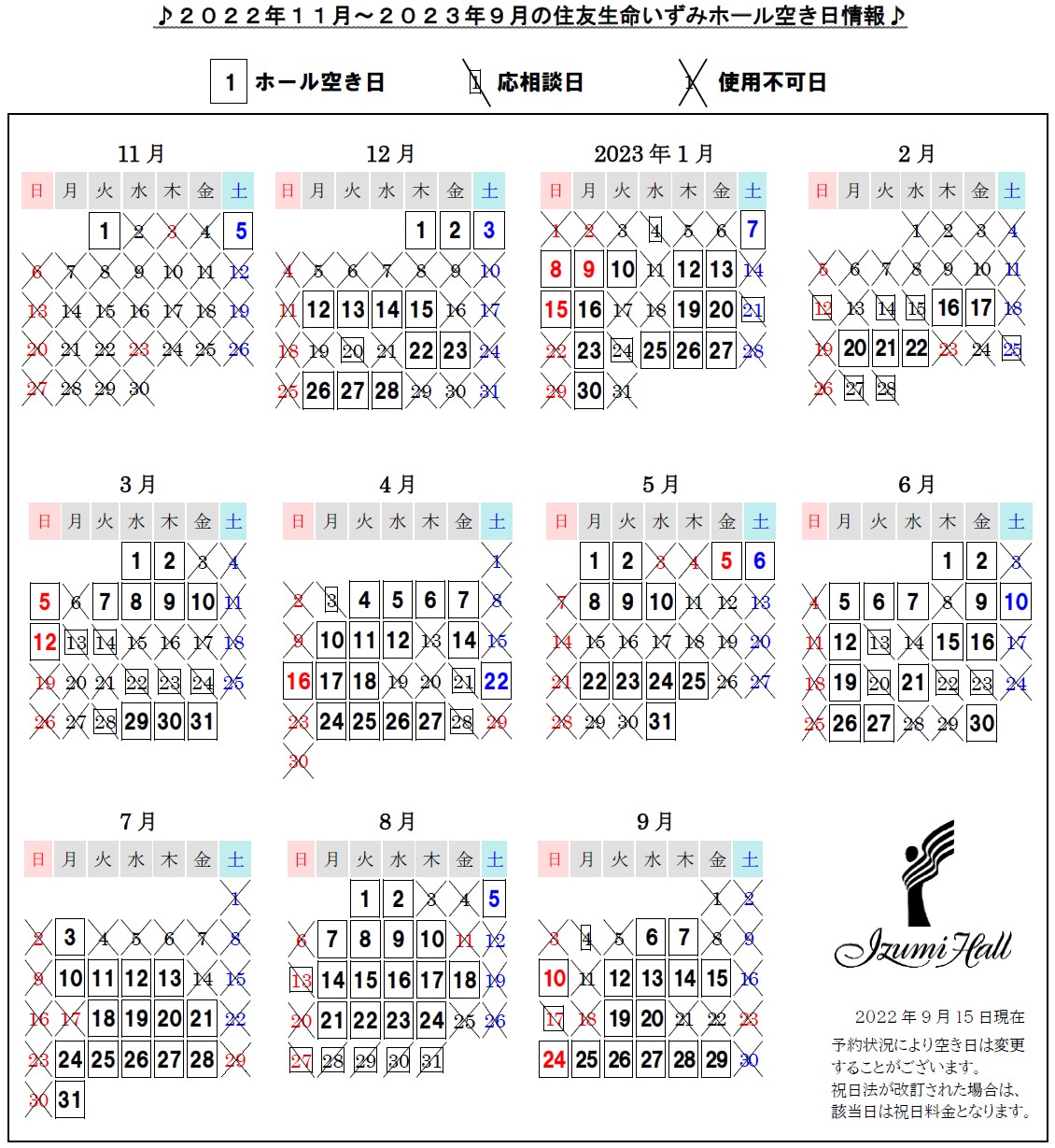 - 住友生命いずみホール 空き状況(2022/9/15現在)