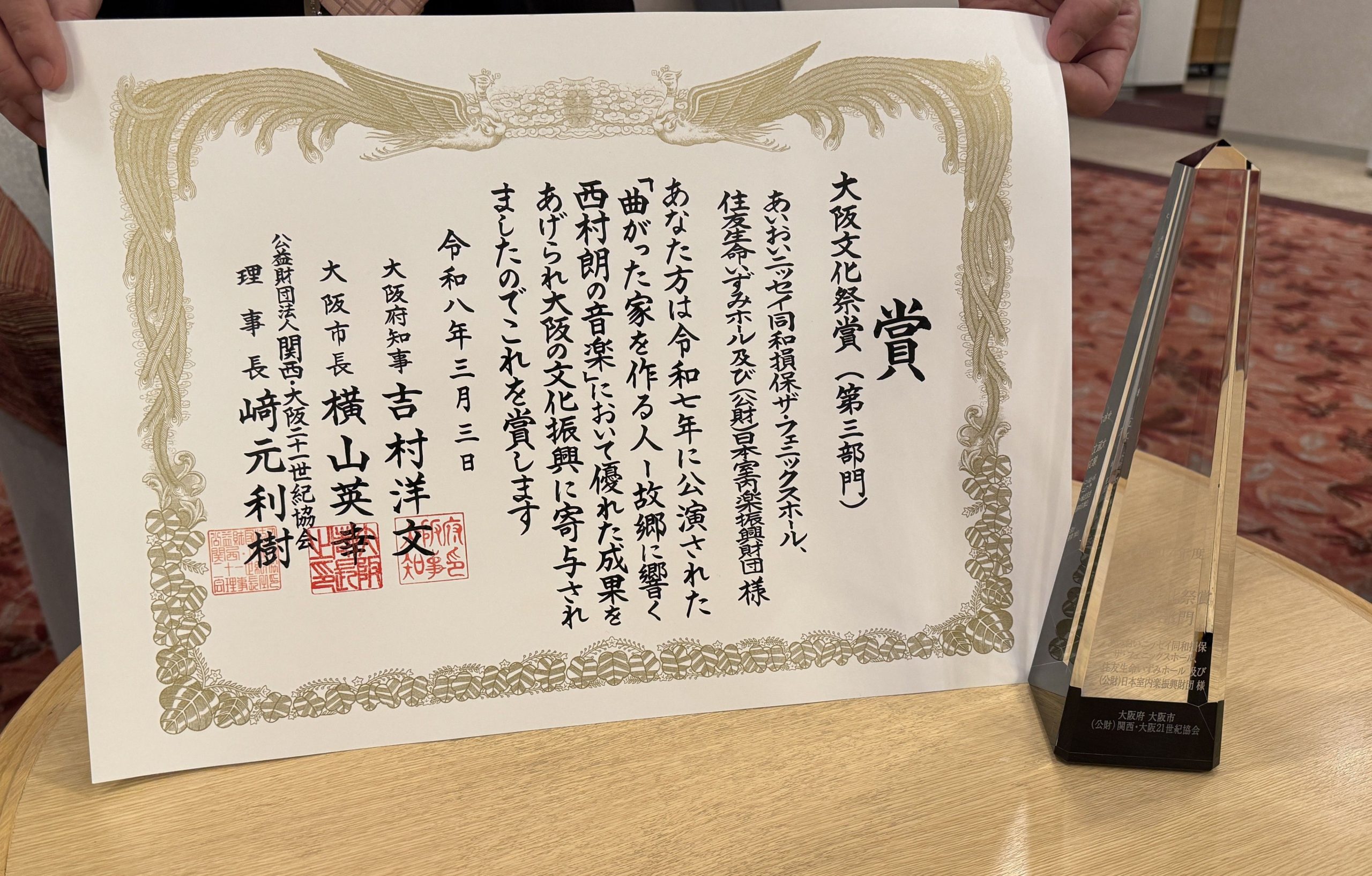 2025年7月に開催いたしました、3団体合同企画『曲がった家を作る人 ―故郷に響く西村 朗の音楽』が令和7年度大阪文化祭賞 第3部門(洋舞・洋楽)を受賞いたしました。