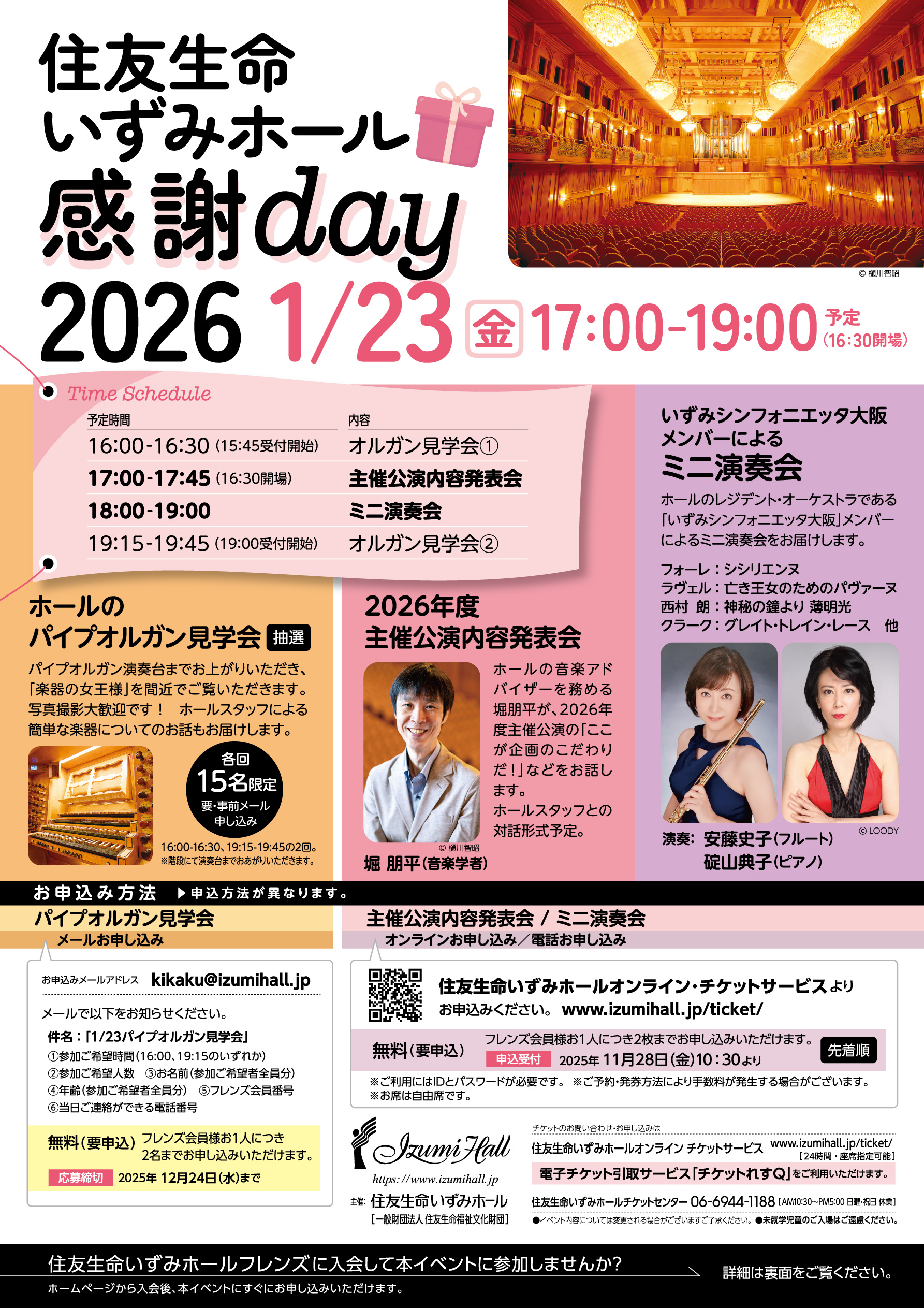 | 公演内容 | ホール有料会員「フレンズ」のみなさまへの感謝の気持ちを込め、会員限定のイベントを開催! 新規入会の方も大歓迎です。 17:00~17:45 2026年度主催公演内容発表会 ホールの音楽アドバイザーを務める堀 朋平とホールの企画担当スタッフが、2026年度主催公演のこだわりや聴きどころをお話いたします。 18:00~19:00 ミニ演奏会 ホールのレジデント・オーケストラ「いずみシンフォニエッタ大阪」のメンバーによるミニ演奏会をお愉しみいただきます。 抽選・パイプオルガン見学会 パイプオルガンの演奏台までお上がりいただき、「楽器の女王様」を間近でご覧いただきます。写真撮影大歓迎です!ホールのスタッフによる簡単な楽器についてのお話もお届けします。 ①16:00-16:30 15名 ②19:15-19:45 15名 ※階段にて演奏台までお上がりいただきます。 |