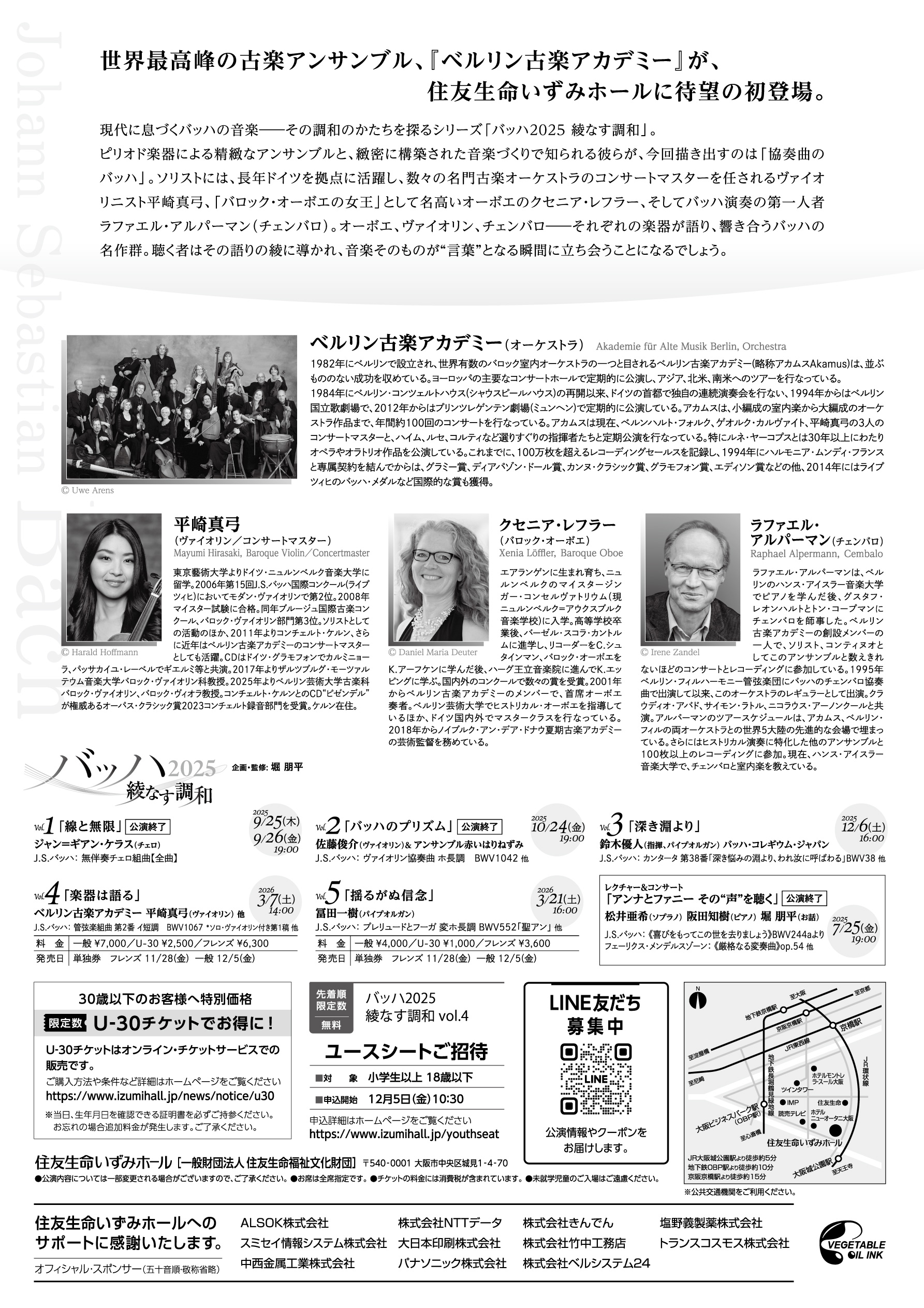 ピリオド楽器による精緻なアンサンブルと、緻密に構築された音楽づくりで知られる彼らが、今回描き出すのは「協奏曲のバッハ」。ソリストには、長年ドイツを拠点に活躍し、数々の名門古楽オーケストラのコンサートマスターを任されるヴァイオリニスト平崎真弓、「バロック・オーボエの女王」として名高いオーボエのクセニア・レフラー、そしてバッハ演奏の第一人者ラファエル・アルパーマン(チェンバロ)。オーボエ、ヴァイオリン、チェンバロ—それぞれの楽器が語り、響き合うバッハの名作群。聴く者はその語りの綾に導かれ、音楽そのものが“言葉”となる瞬間に立ち会うことになるでしょう。
