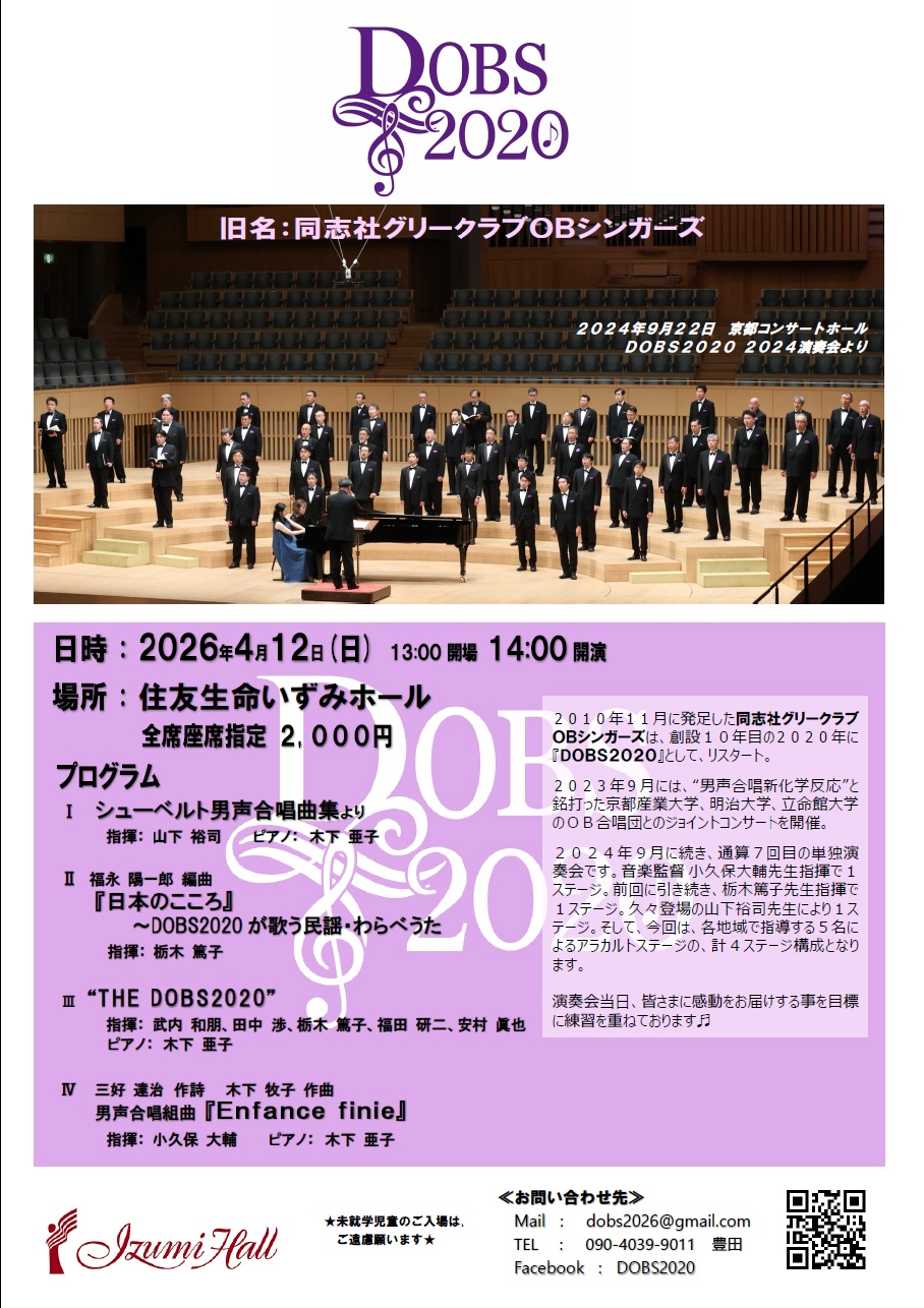 | 出演者 | 小久保大輔、山下裕司、栃木篤子(指揮) 木下亜子(p) DOBS2020(旧同志社グリークラブOBシンガーズ) |