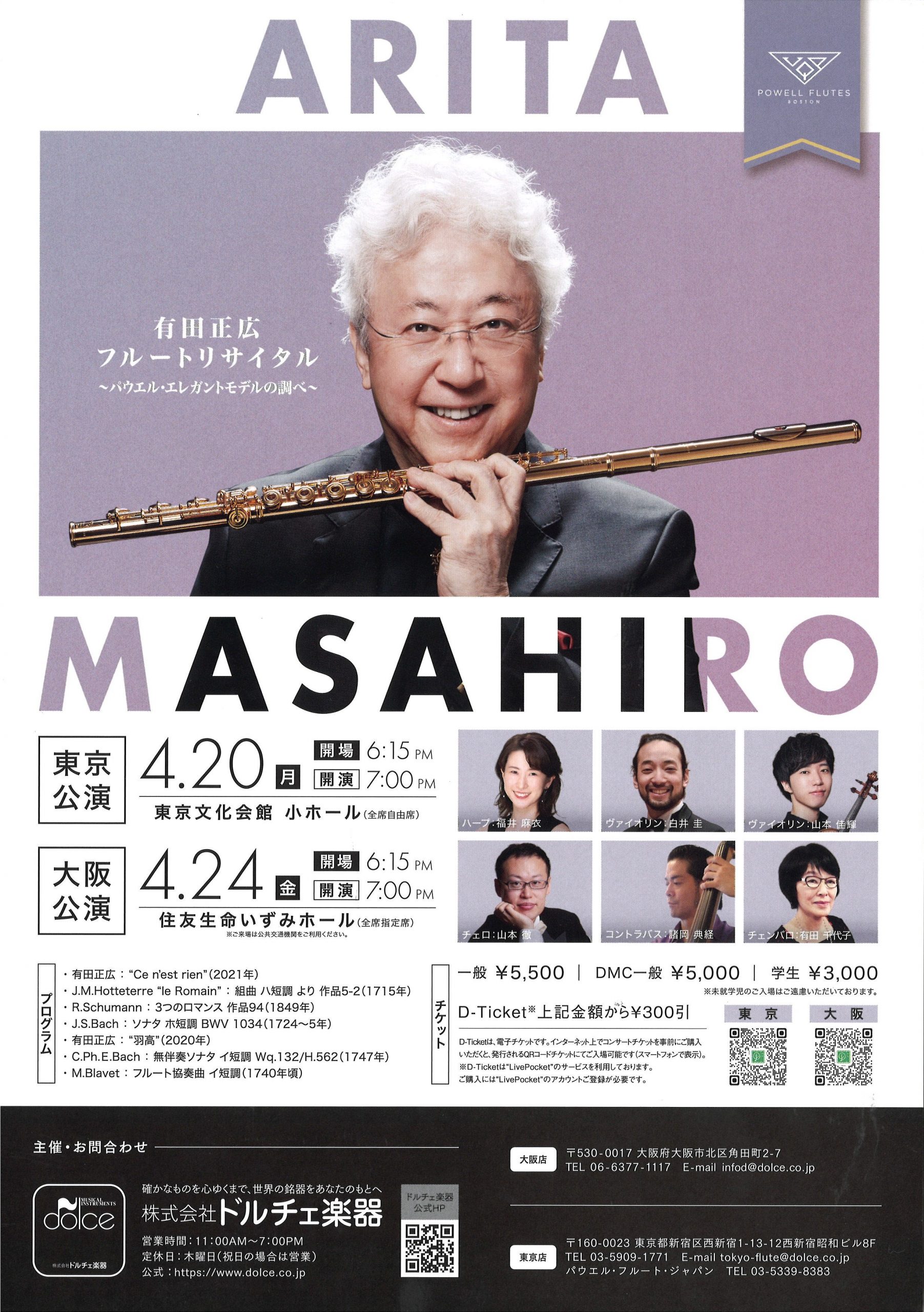 | 料金 | 一般 ¥5,500 学生 ¥3,000 ※DMC会員割引は、ドルチェ楽器のみの取扱 |
