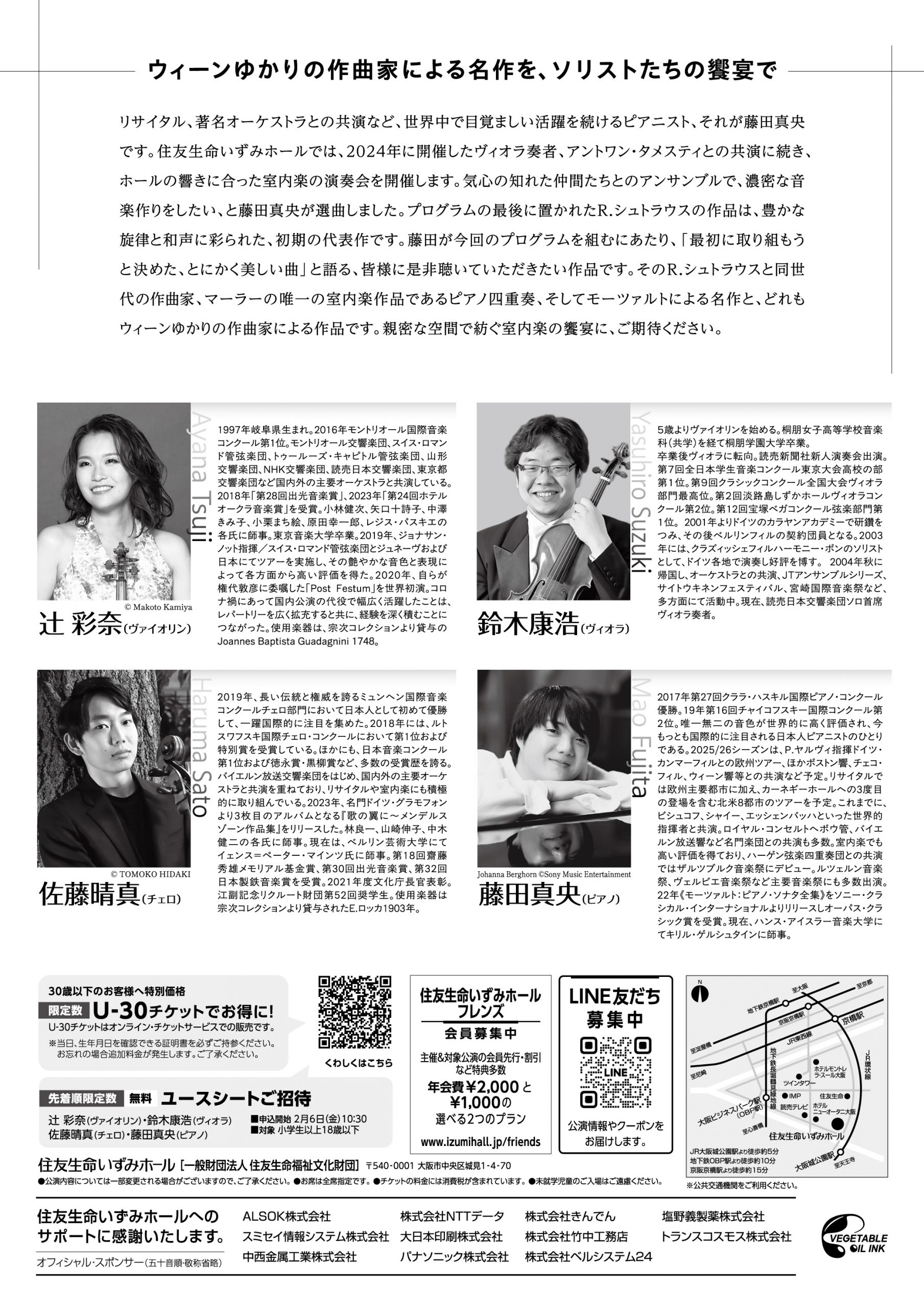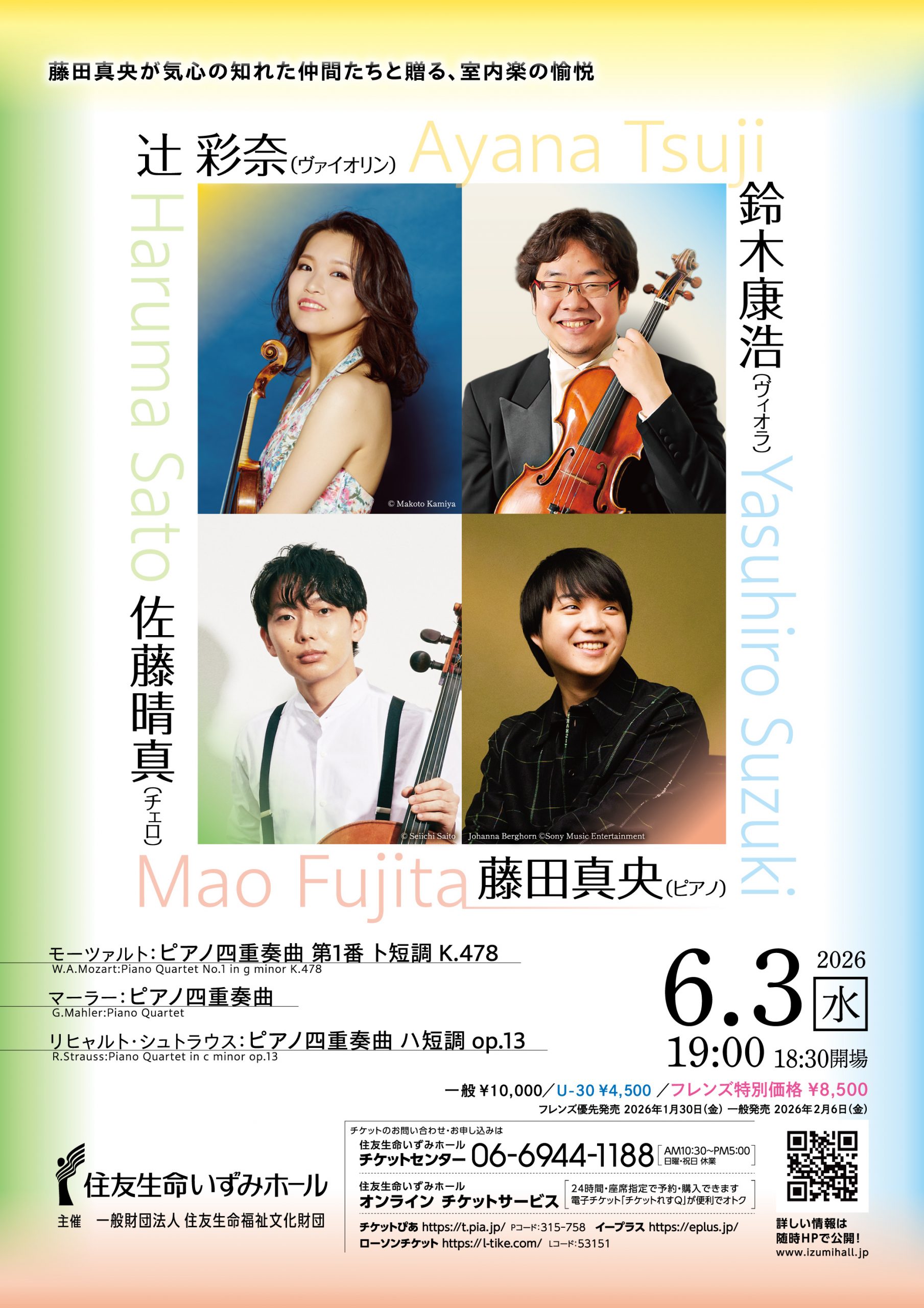 リサイタル、著名オーケストラとの共演など、世界中で目覚ましい活躍を続けるピアニスト、それが藤田真央です。住友生命いずみホールでは、2024年に開催したヴィオラ奏者、アントワン・タメスティとの共演に続き、ホールの響きに合った室内楽の演奏会を開催します。気心の知れた仲間たちとのアンサンブルで、濃密な音楽作りをしたい、と藤田真央が選曲しました。プログラムの最後に置かれたR.シュトラウスの作品は、豊かな旋律と和声に彩られた、初期の代表作です。藤田が今回のプログラムを組むにあたり、「最初に取り組もうと決めた、とにかく美しい曲」と語る、皆様に是非聴いていただきたい作品です。そのR.シュトラウスと同世代の作曲家、マーラーの唯一の室内楽作品であるピアノ四重奏、そしてモーツァルトによる名作と、どれもウィーンゆかりの作曲家による作品です。親密な空間で紡ぐ室内楽の饗宴に、ご期待ください。