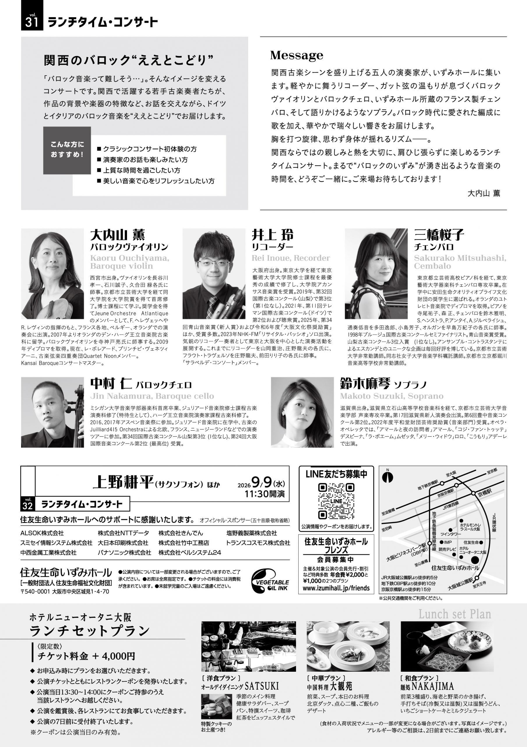 関西ならではの親しみと熱を大切に、肩ひじ張らずに楽しめるランチタイム・コンサート。まるで“バロックのいずみ”が湧き出るような音楽の時間を、どうぞご一緒に。ご来場お待ちしております!