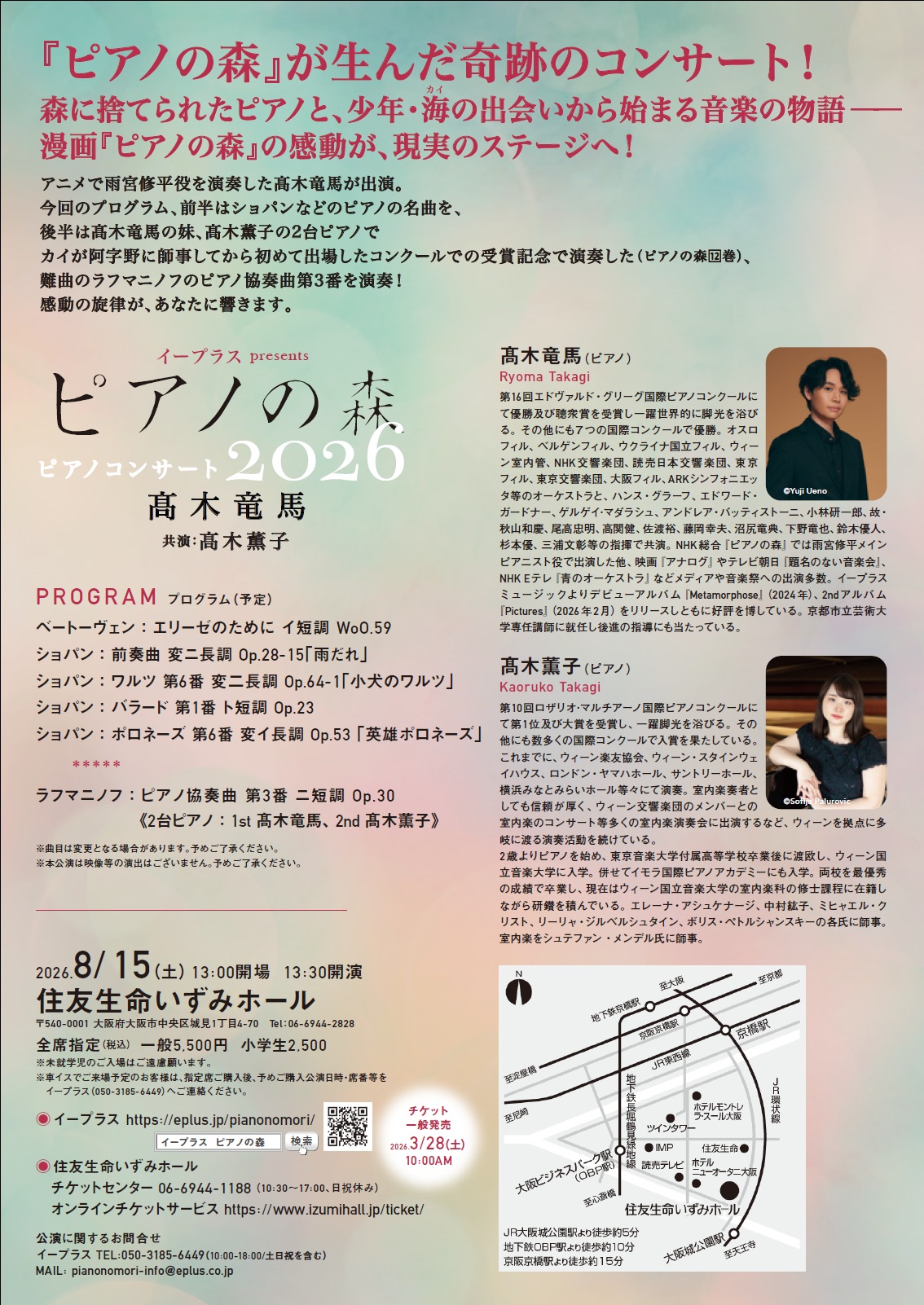 | 演奏曲目 | ベートーヴェン:エリーゼのために イ短調 WoO.59 ショパン:前奏曲 変ニ長調 op.28-15「雨だれ」 ショパン:ワルツ 第6番 変二長調 op.64-1「小犬のワルツ」 ショパン:バラード 第1番 ト短調 op.23 ショパン:ポロネーズ 第6番 変イ長調 op.53「英雄ポロネーズ」 ラフマニノフ:ピアノ協奏曲 第3番 ニ短調 op.30 《2台ピアノ:1st 髙木竜馬、2nd 髙木薫子》 ※本公演は映像等の演出はございません。予めご了承ください。 |
